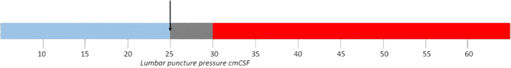 The above graphic illustrates the diagnostic criteria for IIH and IIH without papilledema. Normal lumbar pressure is indicated in the blue area. When lumbar pressure is between 25 and 30 cm of cerebral spinal fluid (the gray area), it can represent normal pressure in some individuals, but can indicate pathologically raised intracranial pressure in other individuals. Measurements in the grey zone need to be interpreted with caution and patients must fit the other criteria for IIH for a diagnosis to be confirmed. Individuals with pressure in the red area have elevated lumbar pressure and have IIH if they meet the above-noted criteria.