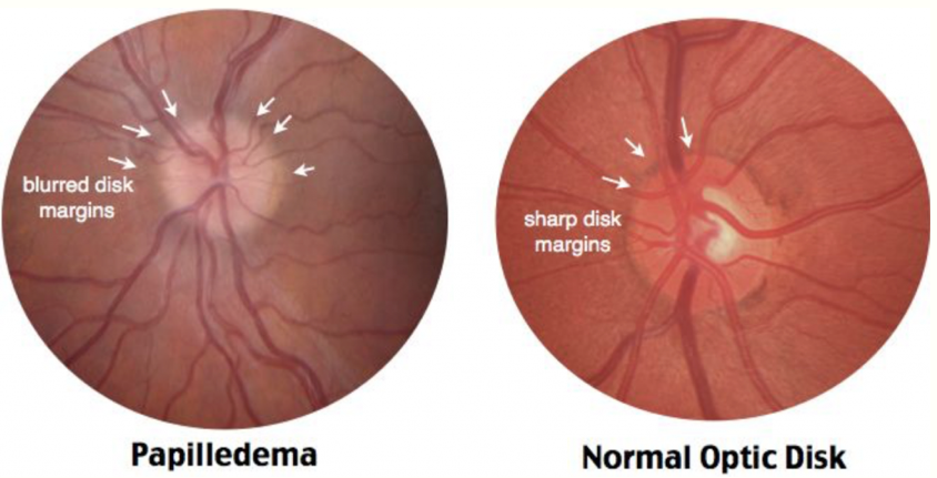 Papilledema (bilateral optic nerve swelling) can be progressive and lead to enlargement of blind spots